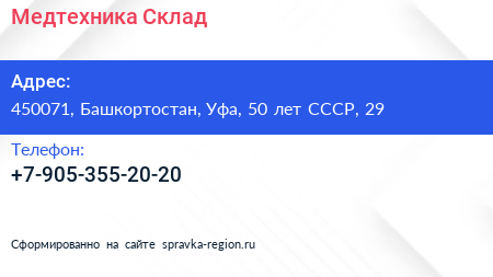Медтехника-Склад по адресу 450071, Башкортостан, Уфа, 50 лет СССР, 29 в дальнейшем Организация, размещена в следующих категориях:
