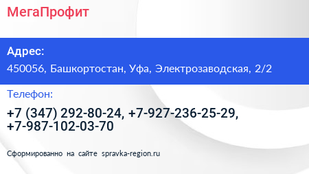 МегаПрофит по адресу 450056, Башкортостан, Уфа, Электрозаводская, 2/2 в дальнейшем Организация, размещена в следующих категориях: