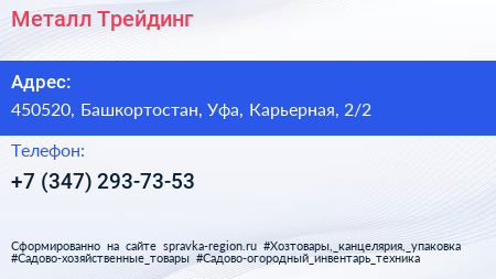 Металл Трейдинг по адресу 450520, Башкортостан, Уфа, Карьерная, 2/2 в дальнейшем Организация, размещена в следующих категориях: