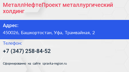 МеталлНефтеПроект, металлургический холдинг по адресу 450026, Башкортостан, Уфа, Трамвайная, 2 в дальнейшем Организация, размещена в следующих категориях: