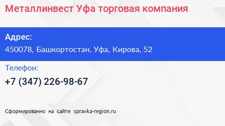 Металлинвест-Уфа, торговая компания по адресу 450078, Башкортостан, Уфа, Кирова, 52 в дальнейшем Организация, размещена в следующих категориях: