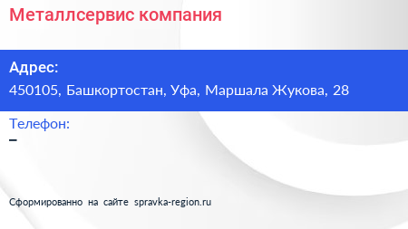 Металлсервис, компания по адресу 450105, Башкортостан, Уфа, Маршала Жукова, 28 в дальнейшем Организация, размещена в следующих категориях: