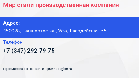 Мир стали, производственная компания по адресу 450028, Башкортостан, Уфа, Гвардейская, 55 в дальнейшем Организация, размещена в следующих категориях: