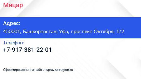 Мицар по адресу 450001, Башкортостан, Уфа, проспект Октября, 1/2 в дальнейшем Организация, размещена в следующих категориях: