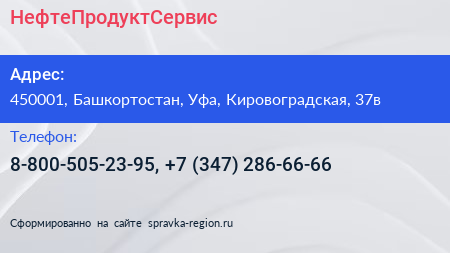 НефтеПродуктСервис по адресу 450001, Башкортостан, Уфа, Кировоградская, 37в в дальнейшем Организация, размещена в следующих категориях: