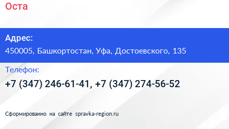 Оста+ по адресу 450005, Башкортостан, Уфа, Достоевского, 135 в дальнейшем Организация, размещена в следующих категориях: