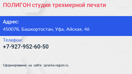 ПОЛИГОН, студия трехмерной печати по адресу 450078, Башкортостан, Уфа, Айская, 46 в дальнейшем Организация, размещена в следующих категориях: