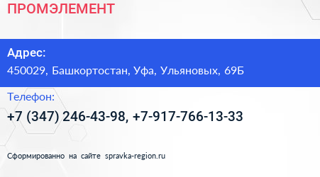 ПРОМЭЛЕМЕНТ по адресу 450029, Башкортостан, Уфа, Ульяновых, 69Б в дальнейшем Организация, размещена в следующих категориях: