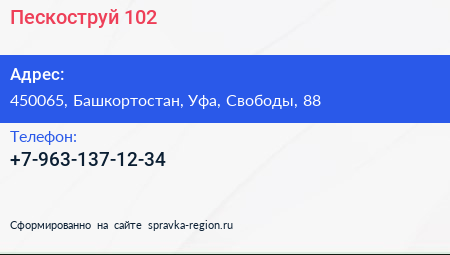Пескоструй 102 по адресу 450065, Башкортостан, Уфа, Свободы, 88 в дальнейшем Организация, размещена в следующих категориях: