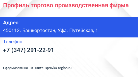 Профиль, торгово-производственная фирма по адресу 450112, Башкортостан, Уфа, Путейская, 1 в дальнейшем Организация, размещена в следующих категориях: