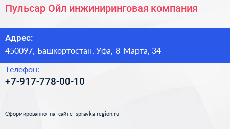 Пульсар Ойл, инжиниринговая компания по адресу 450097, Башкортостан, Уфа, 8 Марта, 34 в дальнейшем Организация, размещена в следующих категориях: