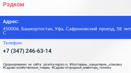 Рэдком по адресу 450006, Башкортостан, Уфа, Сафроновский проезд, 58 лит С в дальнейшем Организация, размещена в следующих категориях: