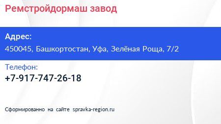 Ремстройдормаш, завод по адресу 450045, Башкортостан, Уфа, Зелёная Роща, 7/2 в дальнейшем Организация, размещена в следующих категориях: