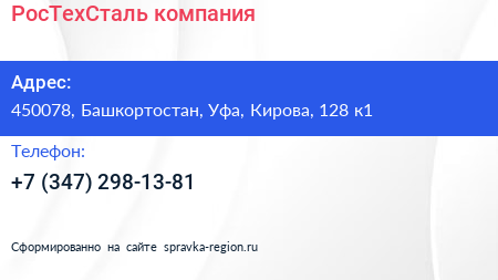 РосТехСталь, компания по адресу 450078, Башкортостан, Уфа, Кирова, 128 к1 в дальнейшем Организация, размещена в следующих категориях: