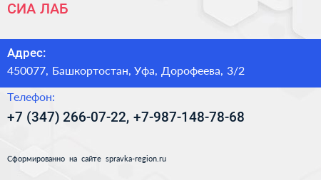 СИА-ЛАБ по адресу 450077, Башкортостан, Уфа, Дорофеева, 3/2 в дальнейшем Организация, размещена в следующих категориях: