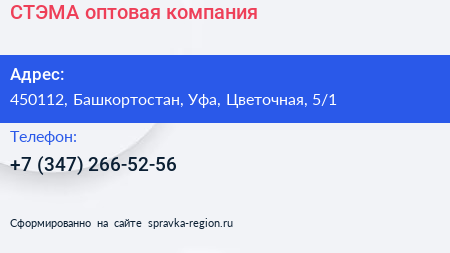 СТЭМА, оптовая компания по адресу 450112, Башкортостан, Уфа, Цветочная, 5/1 в дальнейшем Организация, размещена в следующих категориях: