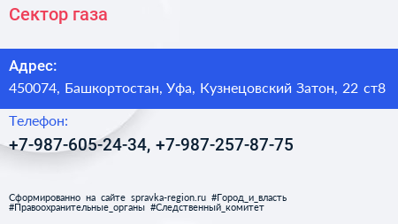 Сектор газа по адресу 450074, Башкортостан, Уфа, Кузнецовский Затон, 22 ст8 в дальнейшем Организация, размещена в следующих категориях: