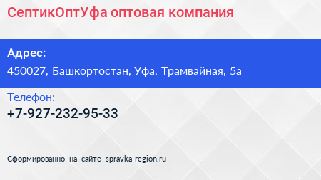 СептикОптУфа, оптовая компания по адресу 450027, Башкортостан, Уфа, Трамвайная, 5а в дальнейшем Организация, размещена в следующих категориях: