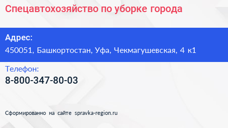 Спецавтохозяйство по уборке города по адресу 450051, Башкортостан, Уфа, Чекмагушевская, 4 к1 в дальнейшем Организация, размещена в следующих категориях: