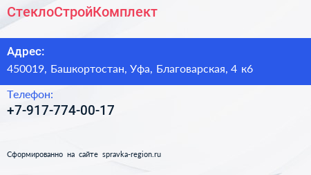 СтеклоСтройКомплект по адресу 450019, Башкортостан, Уфа, Благоварская, 4 к6 в дальнейшем Организация, размещена в следующих категориях: