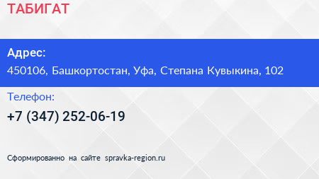 ТАБИГАТ по адресу 450106, Башкортостан, Уфа, Степана Кувыкина, 102 в дальнейшем Организация, размещена в следующих категориях: