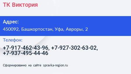 ТК-Виктория по адресу 450092, Башкортостан, Уфа, Авроры, 2 в дальнейшем Организация, размещена в следующих категориях:
