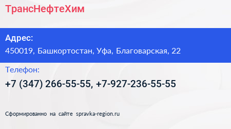 ТрансНефтеХим по адресу 450019, Башкортостан, Уфа, Благоварская, 22 в дальнейшем Организация, размещена в следующих категориях: