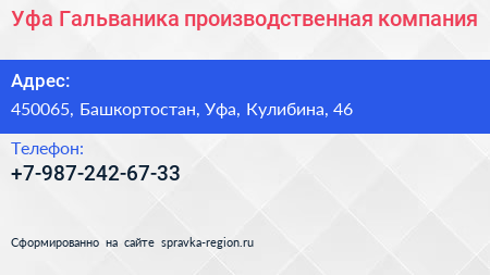Уфа-Гальваника, производственная компания по адресу 450065, Башкортостан, Уфа, Кулибина, 46 в дальнейшем Организация, размещена в следующих категориях:
