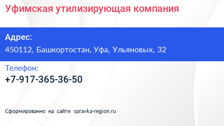 Уфимская, утилизирующая компания по адресу 450112, Башкортостан, Уфа, Ульяновых, 32 в дальнейшем Организация, размещена в следующих категориях: