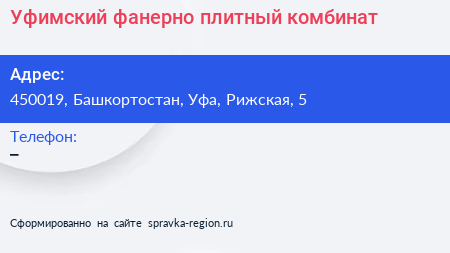 Уфимский фанерно-плитный комбинат по адресу 450019, Башкортостан, Уфа, Рижская, 5 в дальнейшем Организация, размещена в следующих категориях:
