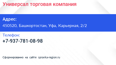 Универсал, торговая компания по адресу 450520, Башкортостан, Уфа, Карьерная, 2/2 в дальнейшем Организация, размещена в следующих категориях: