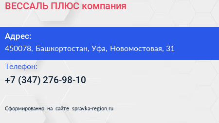 ВЕССАЛЬ ПЛЮС, компания по адресу 450078, Башкортостан, Уфа, Новомостовая, 31 в дальнейшем Организация, размещена в следующих категориях: