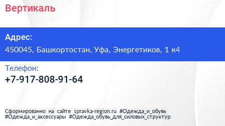 Вертикаль по адресу 450045, Башкортостан, Уфа, Энергетиков, 1 к4 в дальнейшем Организация, размещена в следующих категориях: