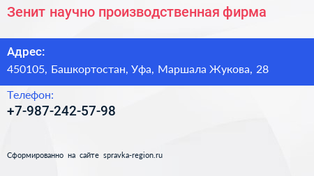 Зенит, научно-производственная фирма по адресу 450105, Башкортостан, Уфа, Маршала Жукова, 28 в дальнейшем Организация, размещена в следующих категориях: