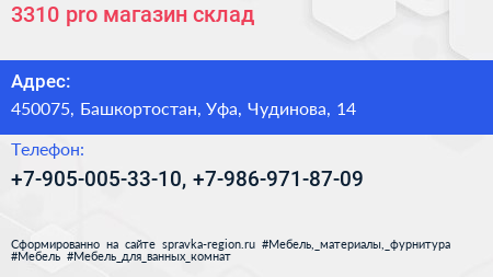 3310.pro, магазин-склад по адресу 450075, Башкортостан, Уфа, Чудинова, 14 в дальнейшем Организация, размещена в следующих категориях: