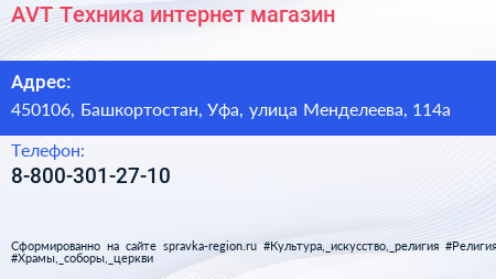 AVT-Техника, интернет-магазин по адресу 450106, Башкортостан, Уфа, улица Менделеева, 114а в дальнейшем Организация, размещена в следующих категориях:
