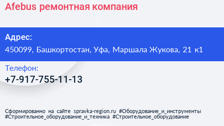 Afebus, ремонтная компания по адресу 450099, Башкортостан, Уфа, Маршала Жукова, 21 к1 в дальнейшем Организация, размещена в следующих категориях: