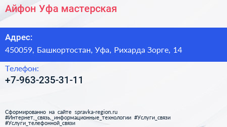 Айфон-Уфа, мастерская по адресу 450059, Башкортостан, Уфа, Рихарда Зорге, 14 в дальнейшем Организация, размещена в следующих категориях: