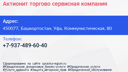 Актионит, торгово-сервисная компания по адресу 450077, Башкортостан, Уфа, Коммунистическая, 80 в дальнейшем Организация, размещена в следующих категориях: