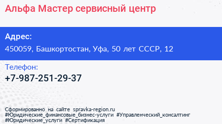 Альфа-Мастер, сервисный центр по адресу 450059, Башкортостан, Уфа, 50 лет СССР, 12 в дальнейшем Организация, размещена в следующих категориях: