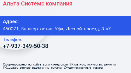 Альта Системс, компания по адресу 450071, Башкортостан, Уфа, Лесной проезд, 3 к7 в дальнейшем Организация, размещена в следующих категориях: