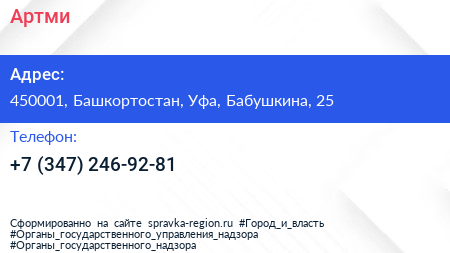 Артми по адресу 450001, Башкортостан, Уфа, Бабушкина, 25 в дальнейшем Организация, размещена в следующих категориях: