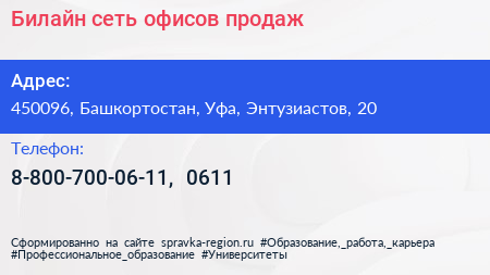 Билайн, сеть офисов продаж по адресу 450096, Башкортостан, Уфа, Энтузиастов, 20 в дальнейшем Организация, размещена в следующих категориях:
