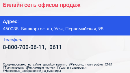 Билайн, сеть офисов продаж по адресу 450038, Башкортостан, Уфа, Первомайская, 98 в дальнейшем Организация, размещена в следующих категориях: