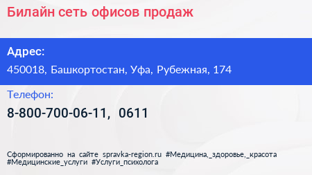 Билайн, сеть офисов продаж по адресу 450018, Башкортостан, Уфа, Рубежная, 174 в дальнейшем Организация, размещена в следующих категориях: