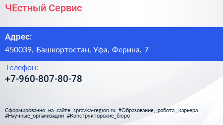 ЧЕстный Сервис по адресу 450039, Башкортостан, Уфа, Ферина, 7 в дальнейшем Организация, размещена в следующих категориях:
