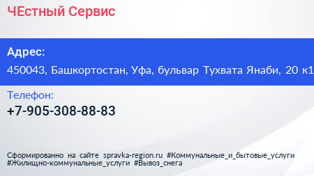 ЧЕстный Сервис по адресу 450043, Башкортостан, Уфа, бульвар Тухвата Янаби, 20 к10 в дальнейшем Организация, размещена в следующих категориях: