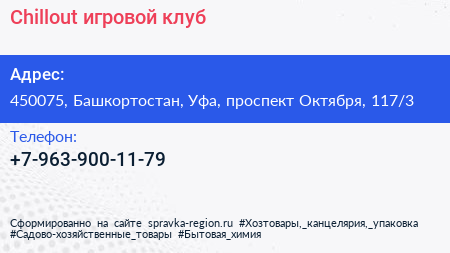 Chillout, игровой клуб по адресу 450075, Башкортостан, Уфа, проспект Октября, 117/3 в дальнейшем Организация, размещена в следующих категориях: