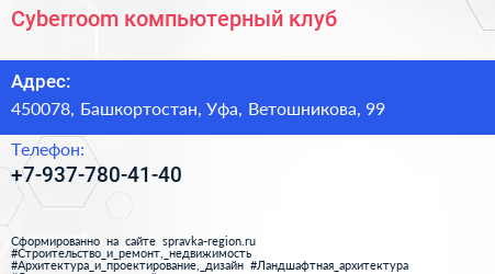 Cyberroom, компьютерный клуб по адресу 450078, Башкортостан, Уфа, Ветошникова, 99 в дальнейшем Организация, размещена в следующих категориях: