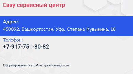 Easy, сервисный центр по адресу 450092, Башкортостан, Уфа, Степана Кувыкина, 18 в дальнейшем Организация, размещена в следующих категориях: